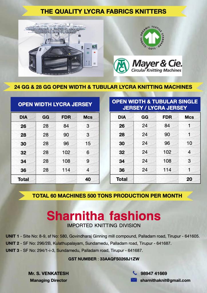 Step into the world of Sharnitha Fashions, where excellence has been intricately knitted into every fabric for over 15 years. Our three cutting-edge knitting units in Tirupur showcase the prowess of 60+ German machines, enabling us to weave dreams into reality. Certified by the Global Organic Textile Standard (GOTS), we are devoted to the highest standards of quality and sustainability, ensuring that every thread tells a story of ethical craftsmanship. Explore the tapestry of our legacy, a seamless fusion of precision and innovation, as tradition meets modernity. With our production capacity of 500 tons per month, we stand ready to meet the diverse needs of our clientele while upholding our commitment to excellence and environmental responsibility.